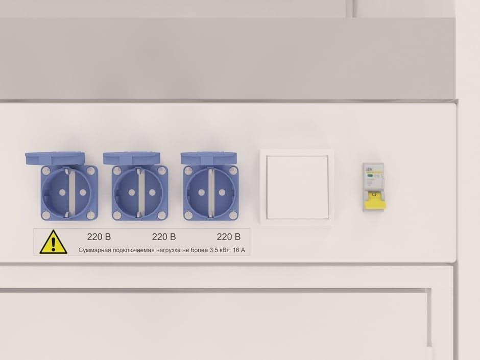 На сервисной панели установлены: автомат аварийного отключения питания 16 А, три брызгозащищенные розетки, выключатель освещения, электромонтажная распределительная коробка с обратной стороны основания. Для подключения к системе вытяжной вентиляции тумба оснащена фланцем диаметром 100 мм.